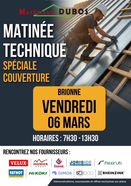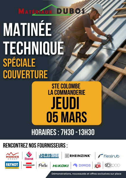 Les équipes Matériaux Dubos vous attendent le JEUDI 05 MARS à SAINTE-COLOMBE-LA-COMMANDERIE et le VENDREDI 06 MARS sur BRIONNE pour 2 matinées dédiées aux solutions pour les COUVREURS !