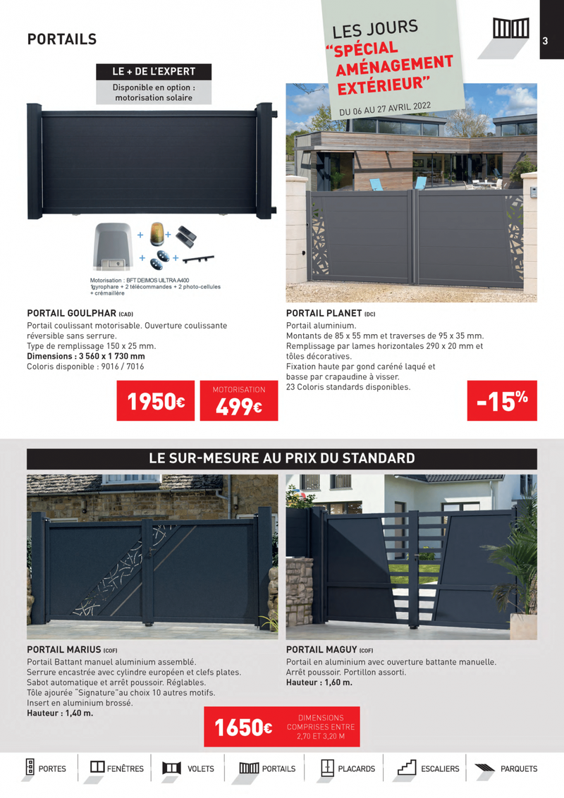 - Portails en aluminium, à motif, coulissants motorisables ou à ouverture battante manuelle.